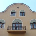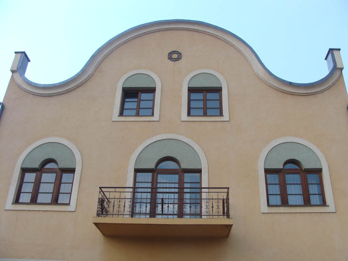 חלונות הקומה הראשונה מרובעים עם מסגרת טיח המקבילה לצורת החלונות. החלונות בקומה זו מחולקים לשלושה חלקים עם חלק מרכזי קמור ומסגרת קמורה. חלונות עליית הגג הן בצורת משולש עם מסגרת קמורה. החלק המרכזי של הבניין מדגש במרפסת בקומה הראשונה עם מעקה העשוי מברזל מחושל. במכז חזית עליית הגג מוצג סמל מגן דוד.