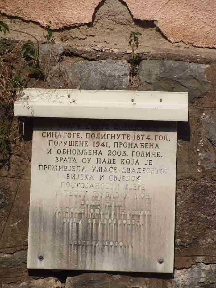 Vrata stare sinagoge su dvokrilna, metalna, lučno završena sa Davidovim zvijezdama na oba krila i ispisanom 1874. godinom.