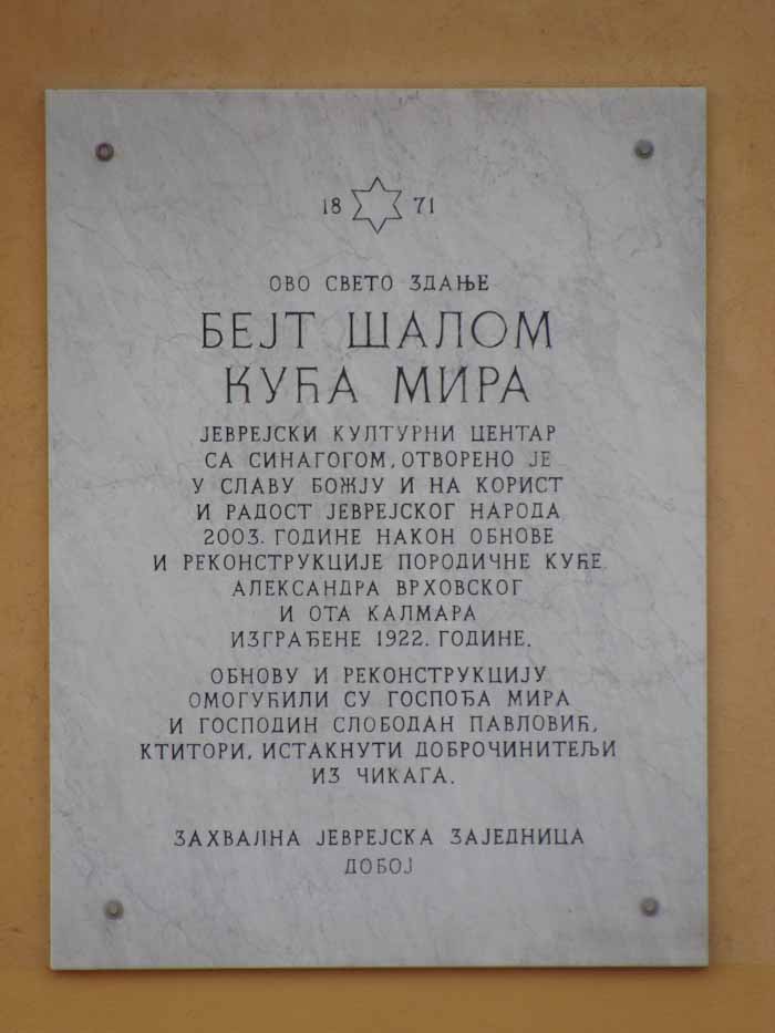 Današnjadobojskasinagogaotvorena jeunovembru 2003. godine, nakonrekonstrukcijeporodičnekućeAleksandraVrhovskogiOtaKalamara,izgrađene 1922. godine,idobilajenazivBejtŠalom, što na hebrejskom značiKućamira. U objektu se nalaze prostorije JevrejskogkulturnogcentraiJevrejskeopštinauDoboju. Na uličnoj fasadi objekta nalazi se mermerna ploča sa ćiriličnim natpisom: Ovo sveto zdanje Kuća mira, Bejt Šalom Jevrejski kulturni centar sa sinagogom, otvoreno je u slavu Božiju i na korist i radost jevrejskog naroda 2003. godine nakon obnove i rekonstrukcije porodične kuće Aleksandra Vrhovskog i Ota Kalmara izgrađene 1922. godine. Obnovu i rekonstrukciju omogućili su gospođa Mira i gospodin Slobodan Pavlović ktitori, istaknuti dobročinitelji iz Čikaga. Zahvalna Jevrejska zajednica Doboj. Iznad natpisa, u srednjem dijelu, uklesana je Davidova zvijezda sa ispisanom 1871. godinom.