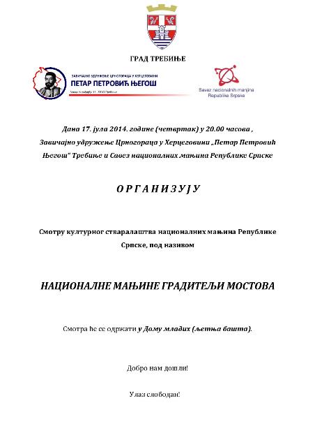 Zavičajno udruženje Crnogoraca u Hercegovini „Petar Petrović Njegoš“ Trebinje u saradnji sa Savezom nacionalnih manjina Republike Srpske organizovaće u četvrtak 17. jula 2014. godine sa početkom u 20.00 časova manifestaciju „Nacionalne manjine graditelji mostova“ u ljetnjoj bašti Doma mladih u Trebinju.