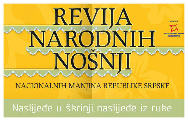 SAVEZ NACIONALNIH MANJINA REPUBLIKE SRPSKE organizuje reviju narodnih nošnji nacionalnih manjina pod nazivom "NASLIJEĐE U ŠKRINJI, NASLIJEĐE IZ RUKE". Revija će se održati u Prijedoru, 23. septembra 2011. godine sa početkom u 19:30 časova u Lapidariju Muzeja Kozara i u Prnjavoru, 24. septembra sa početkom u 19:30 časova u Domu kulture.