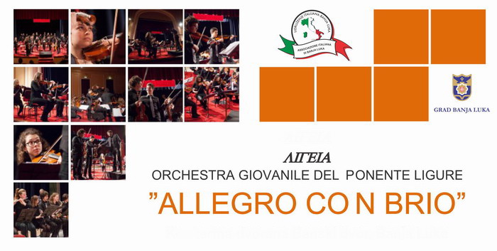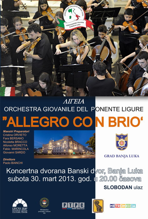 Udruženje Italijana Banja Luka poziva Vas na koncert orkestra GIOVANILE DEL PONENTE LIGURE „ALLEGRO CON BRIO“, koji će se održati u subotu 30. marta 2013. godine u 20 časova, u koncertnoj dvorani Banskog dvora. Ulaz je slobodan